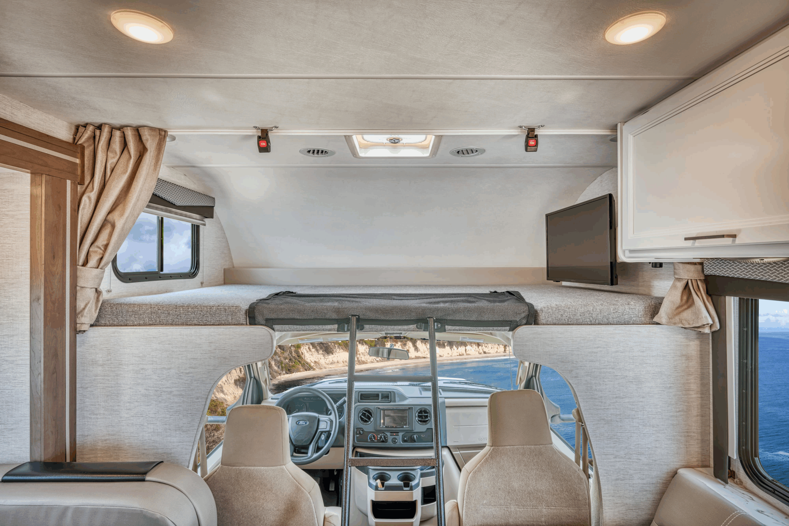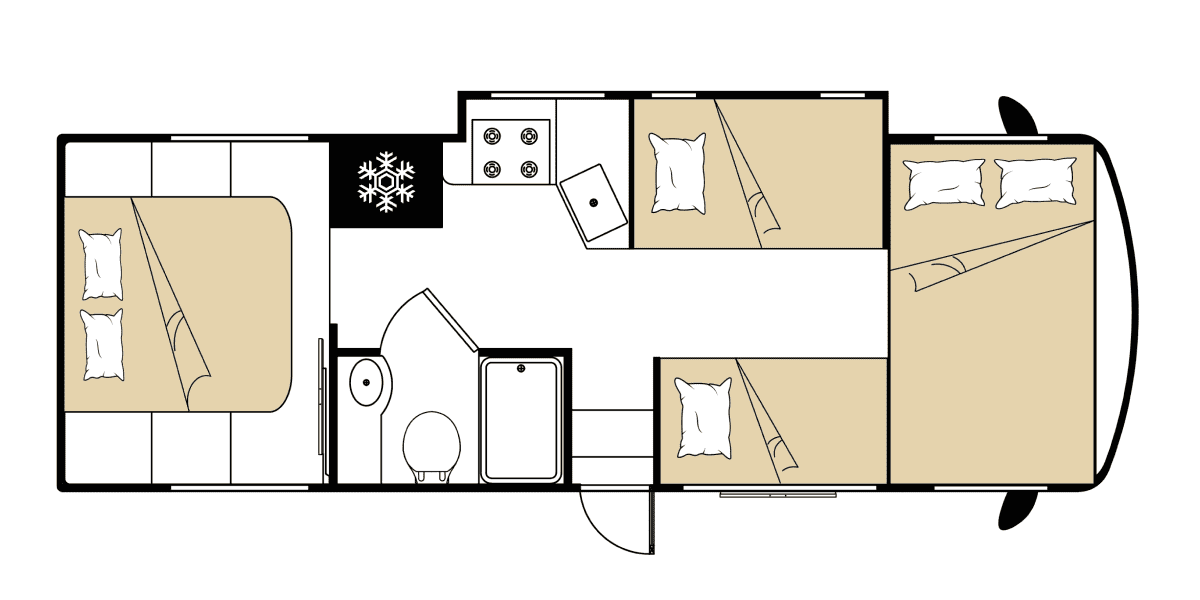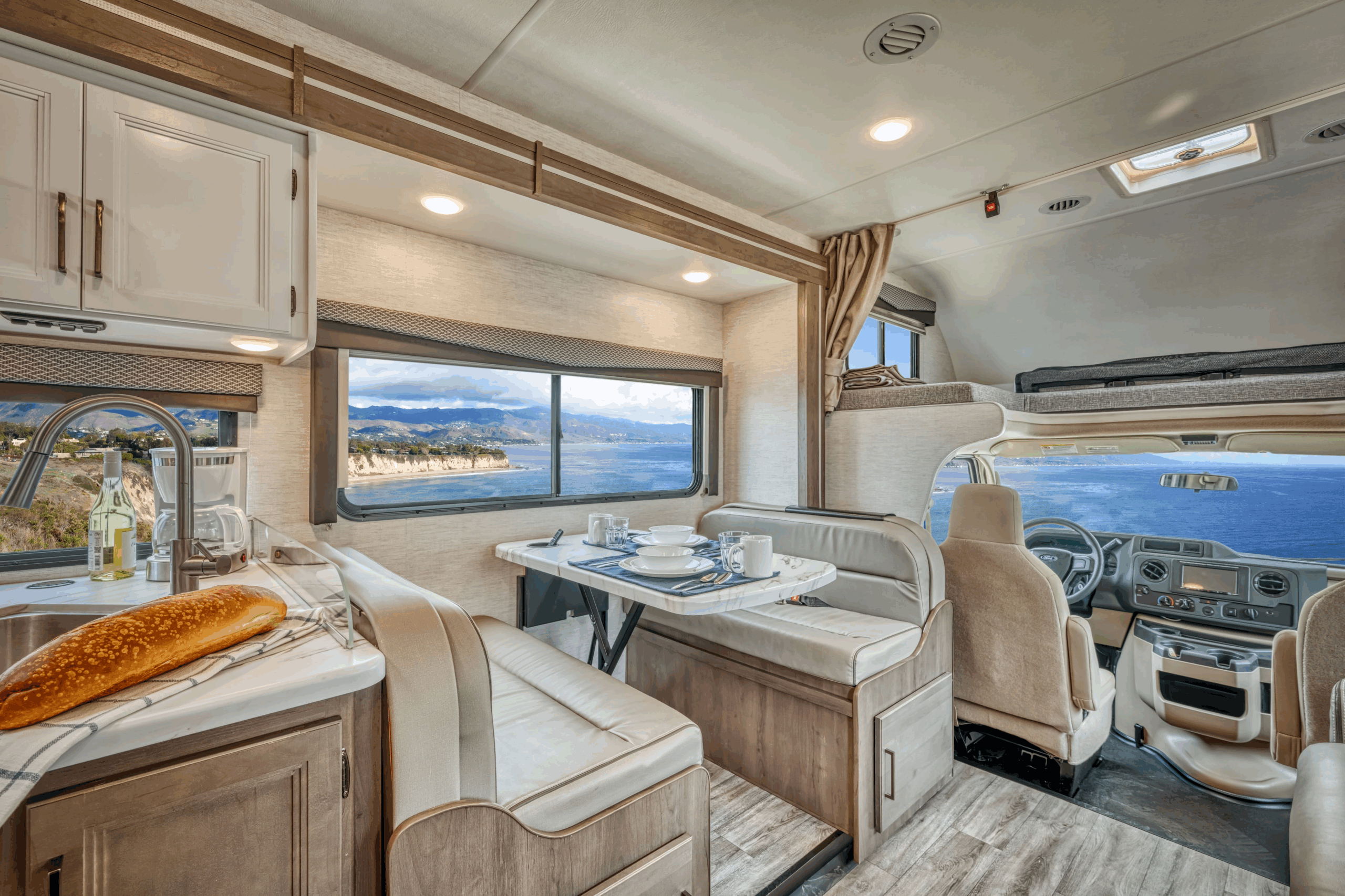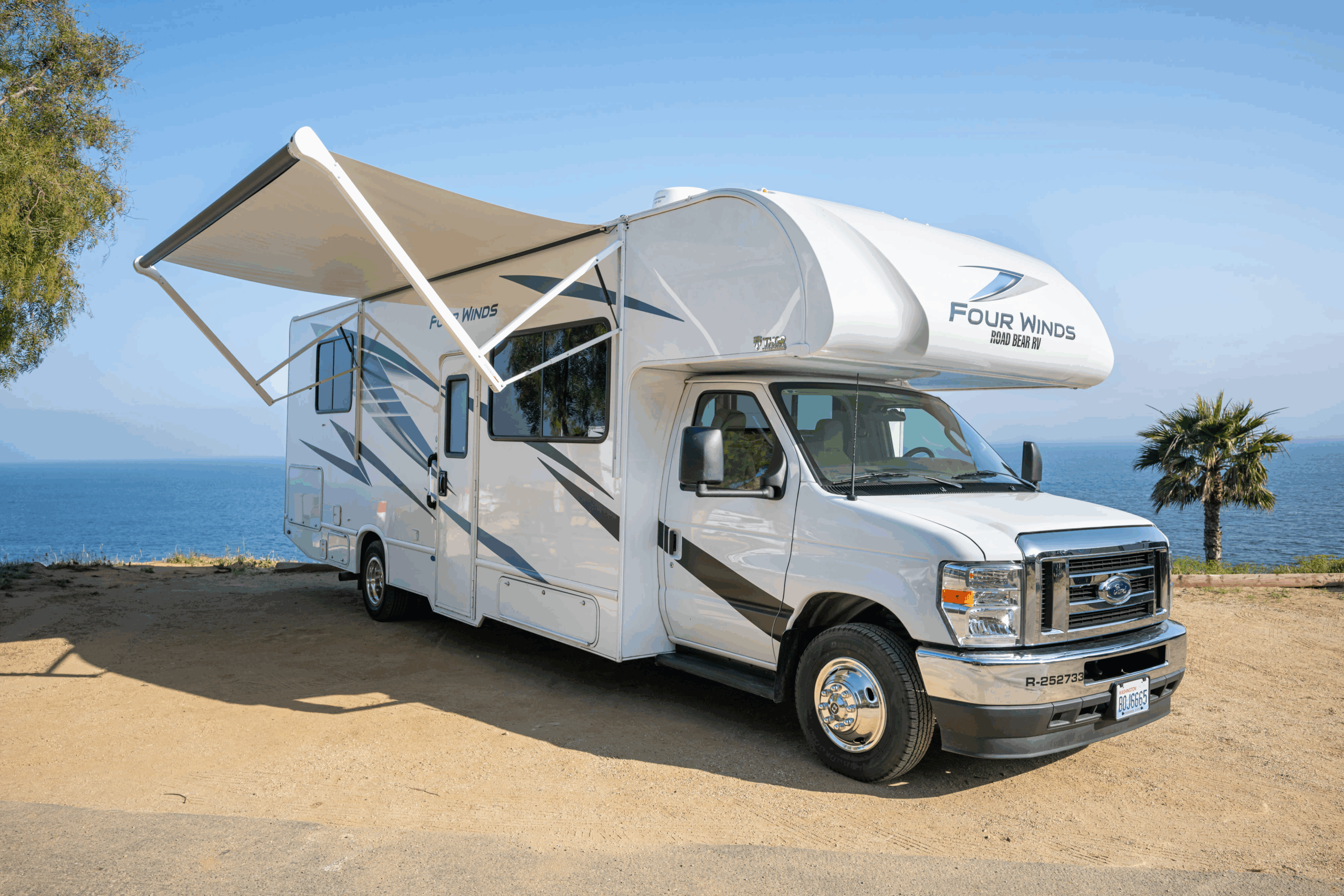 O motorhome Road Bear Classe C de 29-31 pés é ideal para a família, acomodando até 7 pessoas com uma cama queen, uma cama sobre a cabine, uma cama pequena e um sofá-cama. Com um motor Ford V8 potente e sala deslizante, oferece conforto e conveniência para suas férias. Mesmo em dias de chuva, você pode relaxar dentro ou sob o toldo e apreciar as vistas que só uma viagem de motorhome proporciona.